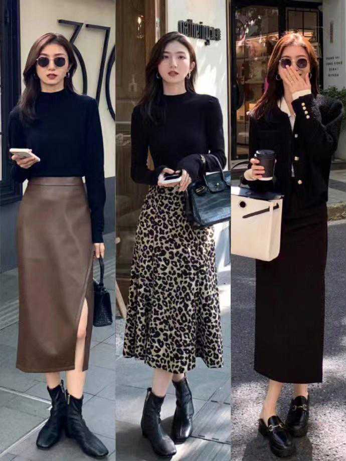 皮质面料的半身裙具有很好的防风效果,冬天穿会更加的保暖,上衣搭配黑色中高领打底衫,简约而又高级,这是比较成熟范儿的内搭,受很多的都市白领追捧哦。