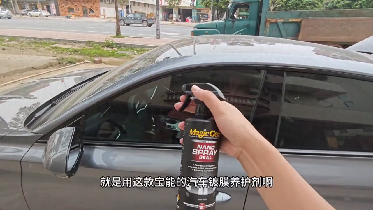好神奇,让我们看一下这边。为什么车窗这边这么神奇,而这边却没有这种效果?就是用这款宝能的汽车镀膜养护剂,很简单的使用。