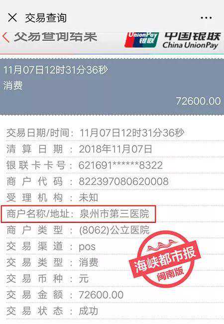 更让人气愤的是,本月,李女士向康桥优年要求退款时,突然被告知,她此前刷卡的7.26万元款项并未打入康桥优年的账上。“说我的交款信息既然显示第三医院,就去找第三医院要钱。”李女士无奈地说,前天下午,她前往银行查询,发现这笔交易的商户名称确实是“泉州市第三医院”。