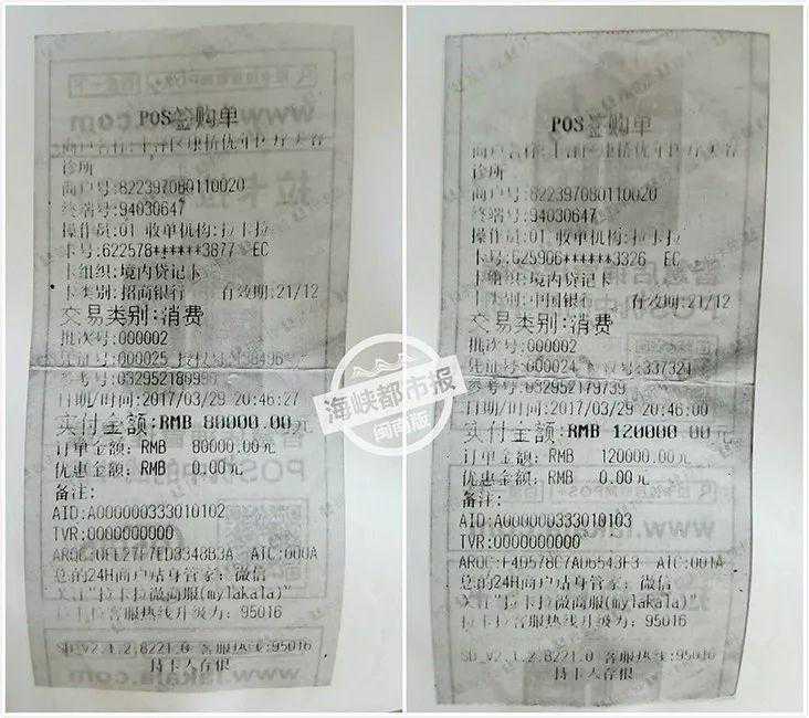 无独有偶,昨日上午,蔡女士在协调退款难题时发现,虽然刷卡小票显示消费商户是丰泽区康桥优年医疗美容诊所,但是银行流水却显示,这20万元的收款商户名称竟成了福州市鼓楼区华大街道龙峰社区卫生服务站。