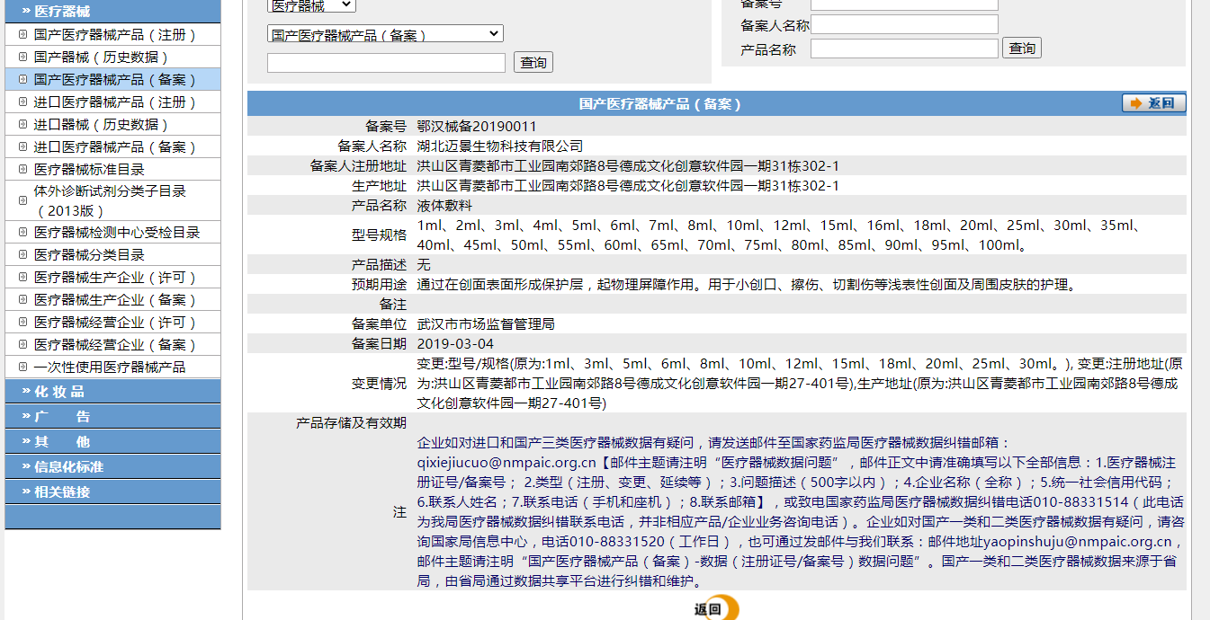 作为一款可以注射使用的医美产品,第一财经记者在国家药监局网站的特殊化妆品中并没有查到。但记者在国家药监局国产医疗器械产品(备案)”数据库查询到了奕唯青春支架,其备案号为“鄂汉械备20190011号”,备案人为湖北迈景生物科技有限公司,产品名称为“液体敷料”,其预期用途为“通过在创面表面形成保护层”,起物理屏障作用,用于小创口、擦伤、切割伤等浅表性创面及周围皮肤的护理。