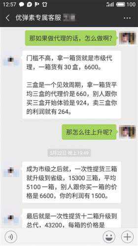 根据优弹素客服提供的代理报价,一盒68克(6.8克×10条)的优弹素胶原蛋白弹性蛋白维C固体饮料(果汁产品为30ml×10条),其全国总代理拿货价为120元,省级代理拿货价为170元,市级代理拿货价为220元,“体验代理”拿货价为308元,终端零售价则高达368元。而按照优弹素的官方说法,3盒是一个“见效周期”,这意味着普通消费者一次消费通常至少要支出1104元。