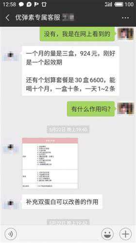 尽管优弹素客服对其产品效果充满信心,但食品科普作者云无心向新京报记者透露,“双蛋白”实则是国民营养计划中的一个食品营养概念,优弹素提出的“双蛋白”美容属于滥用名词。