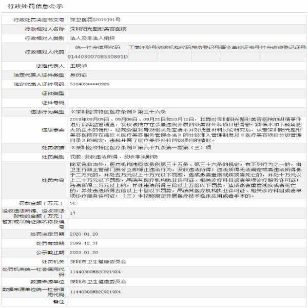 深圳市卫健委表示,依据《深圳经济特区医疗条例》第六十九条第一款第(三)项,对深圳阳光整形美容医院罚款52万元,没收违法所得、没收非法财物17万元。