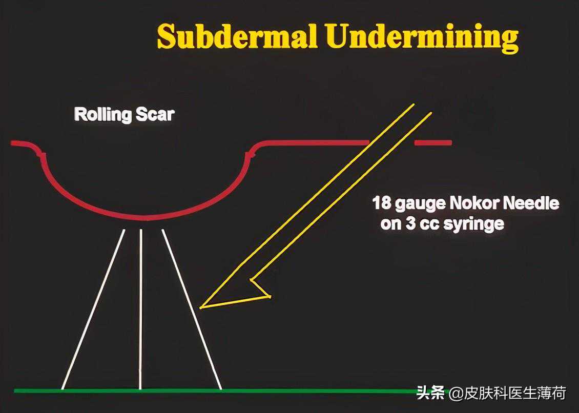 将皮下的粘连的纤维松解开,让皮下出血并形成皮下的血凝块,创造一个潜在的空间提升疤痕内的皮肤,适合滚轮样疤痕。