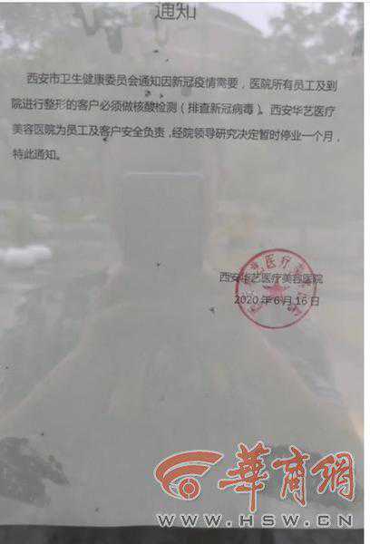 今年5月份,这家医院一直跟他对接的工作人员给他通知说,让他6月份来店里接受治疗。但他6月中旬去的时候,医疗大门紧闭,里面空无一人。门口贴了张通知,说是根据西安市健康委员会通知,因新冠疫情需要,医院所有员工及到院进行整形的客户必须做核酸检测,并称该医疗美容医院为员工及客户安全负责,经院领导研究决定暂时停业一个月。落款日期是6月16日。