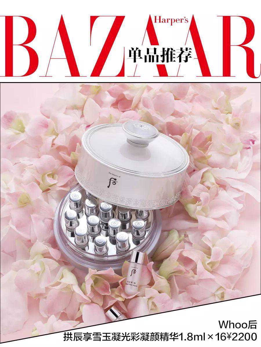 白皙美肌铸就春日亮色,国色佳人焕发自信光彩。Whoo后甄选白山参、珍珠山参等珍贵草本成分,为都市皇后的瓷肌愿望献礼美白安瓶——雪玉凝光彩凝颜精华。点亮非凡明媚面庞,为肌肤注入美白能量,集锦古法美白秘方,全方位密集亮泽肌肤,淡化黑色素,抵抗紫外线。令皇后温和焕亮肤色,缔造珍珠般嫩白容颜。