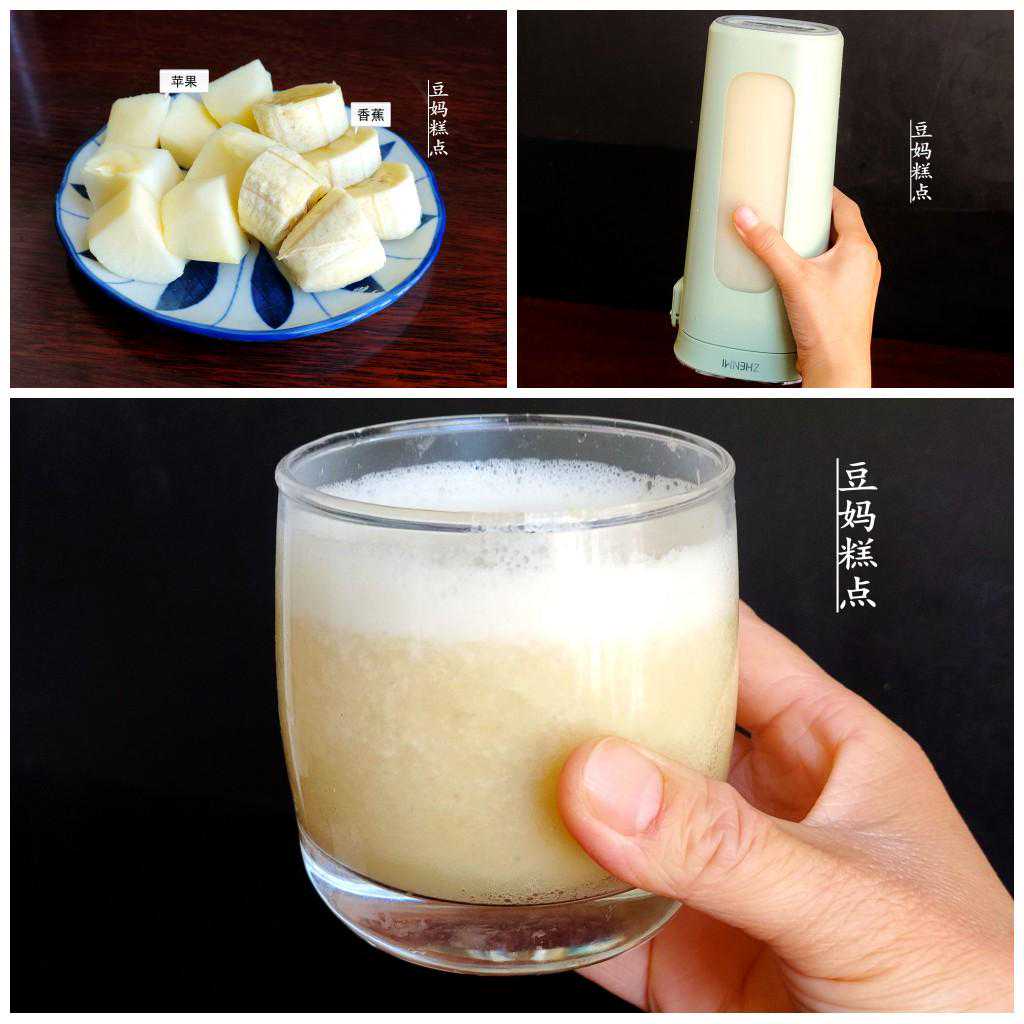 苹果一半、香蕉一半,加入温水或者牛奶打成汁。