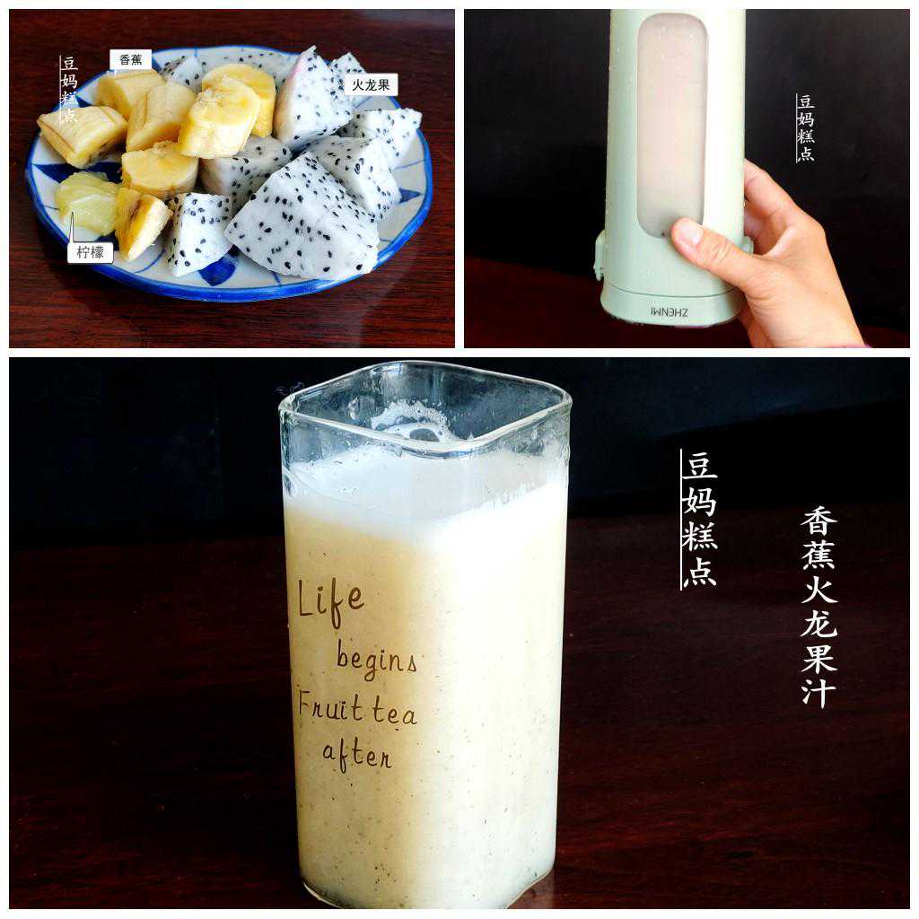 香蕉火龙果汁香蕉半根、火龙果1/4个,柠檬果肉1小块(没有可不用也好喝),加入适量温水,一起28s搅打成汁。