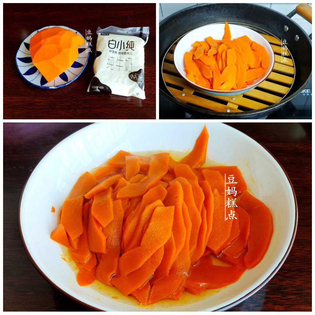 2、南瓜切成薄片,蒸熟。