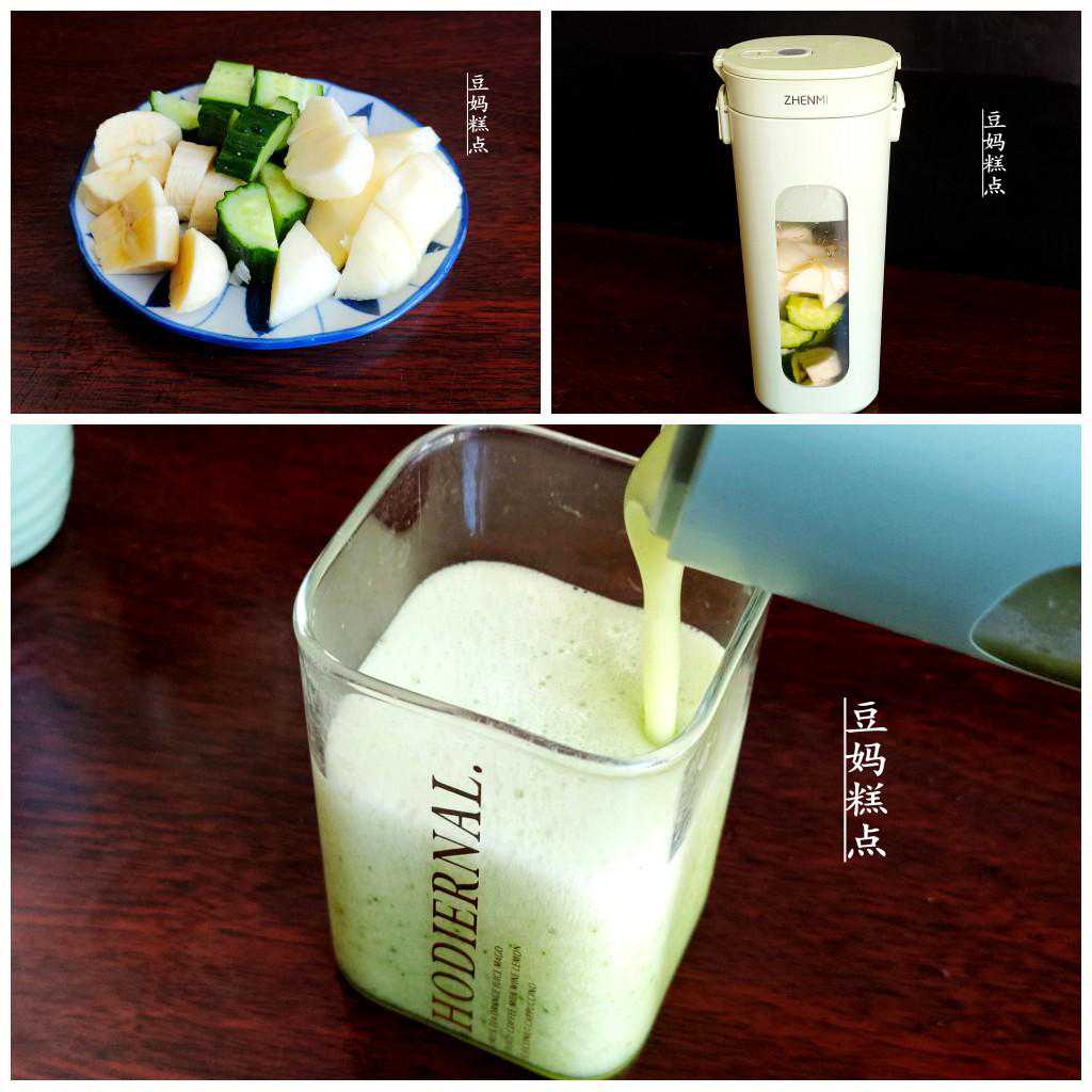 黄瓜、苹果、香蕉各取三分之一根,切成小块,加水,一起打好即可。