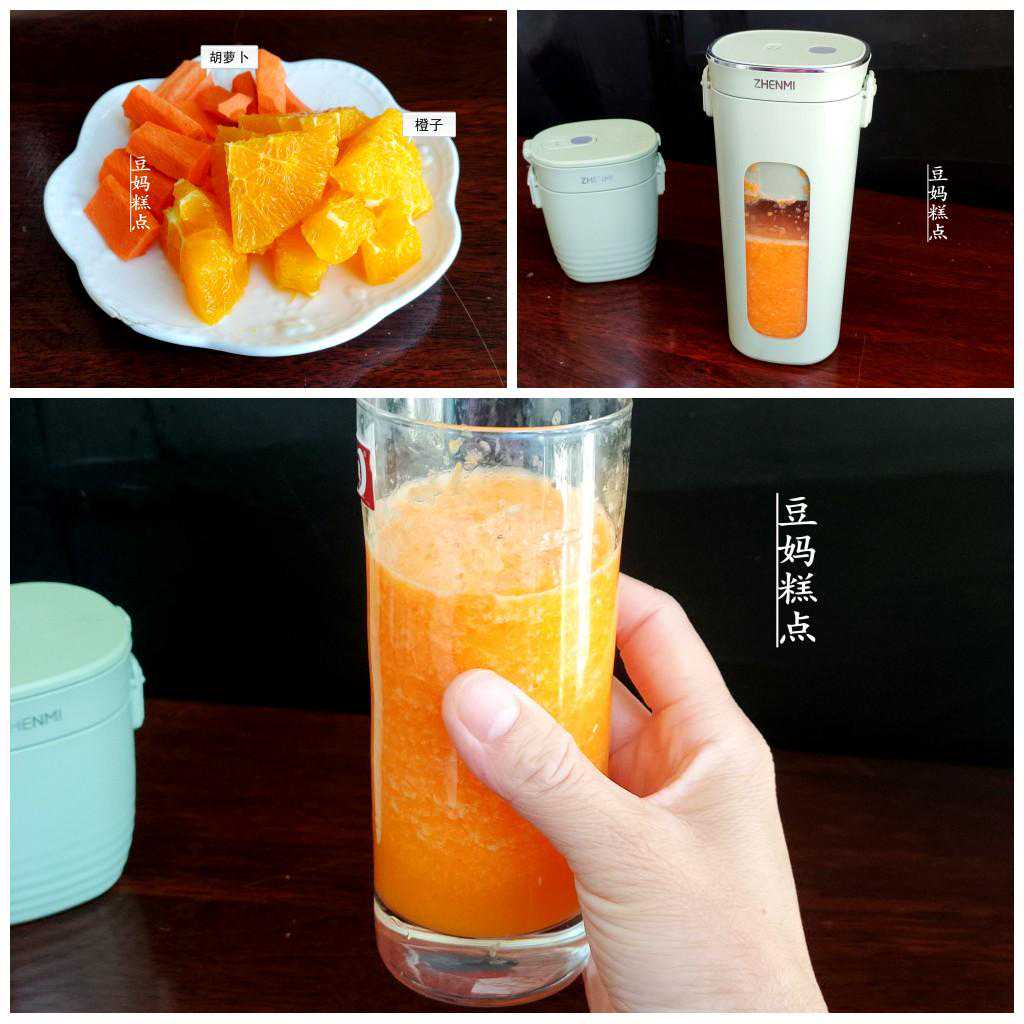 胡萝卜橙汁胡萝卜1/4根、橙子肉半个,加入适量温水,28s搅拌成汁。