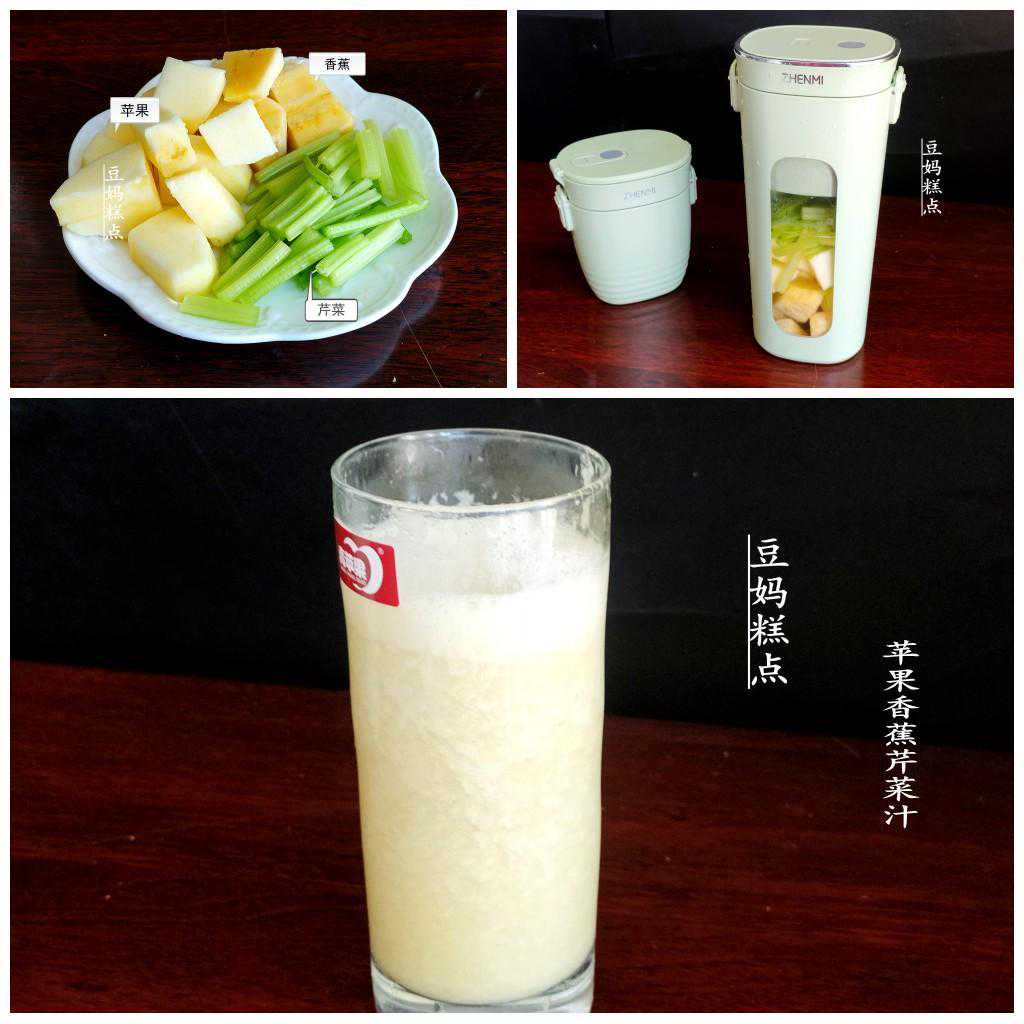 苹果香蕉芹菜汁苹果1/3个、香蕉1/3根、芹菜6根切段,一起放入果汁杯中,加入温水,搅打成汁。