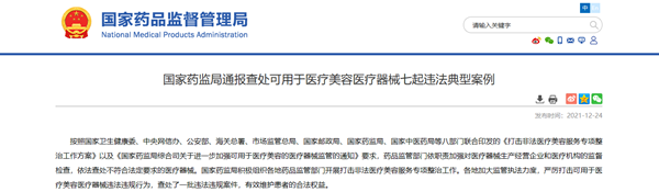 中国网财经12月27(记者苏萌)日前,国家药监局通报查处可用于医疗美容医疗器械七起违法典型案例。